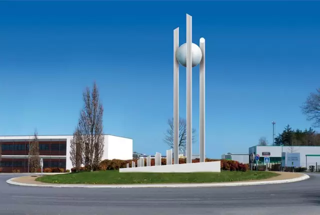 « Inscrite au sol dans une surface rectangulaire de section dorée (4.05 x 2.05 m), la structure est en relation avec l’art du bâti traditionnel. Sur une assise de béton bouchardé témoignant par son volume et sa forme de la volonté d’ancrage dans la solidité, sortent en ordre croissant douze éléments cylindriques métalliques symbolisant les entreprises en devenir, dont l’une d’entre elles atteint six mètres de hauteur. Ces colonnes portent une sphère polie, image du monde auquel nous appartenons et que nous maintenons en équilibre par nos connaissances et notre savoir-faire en constante évolution. »